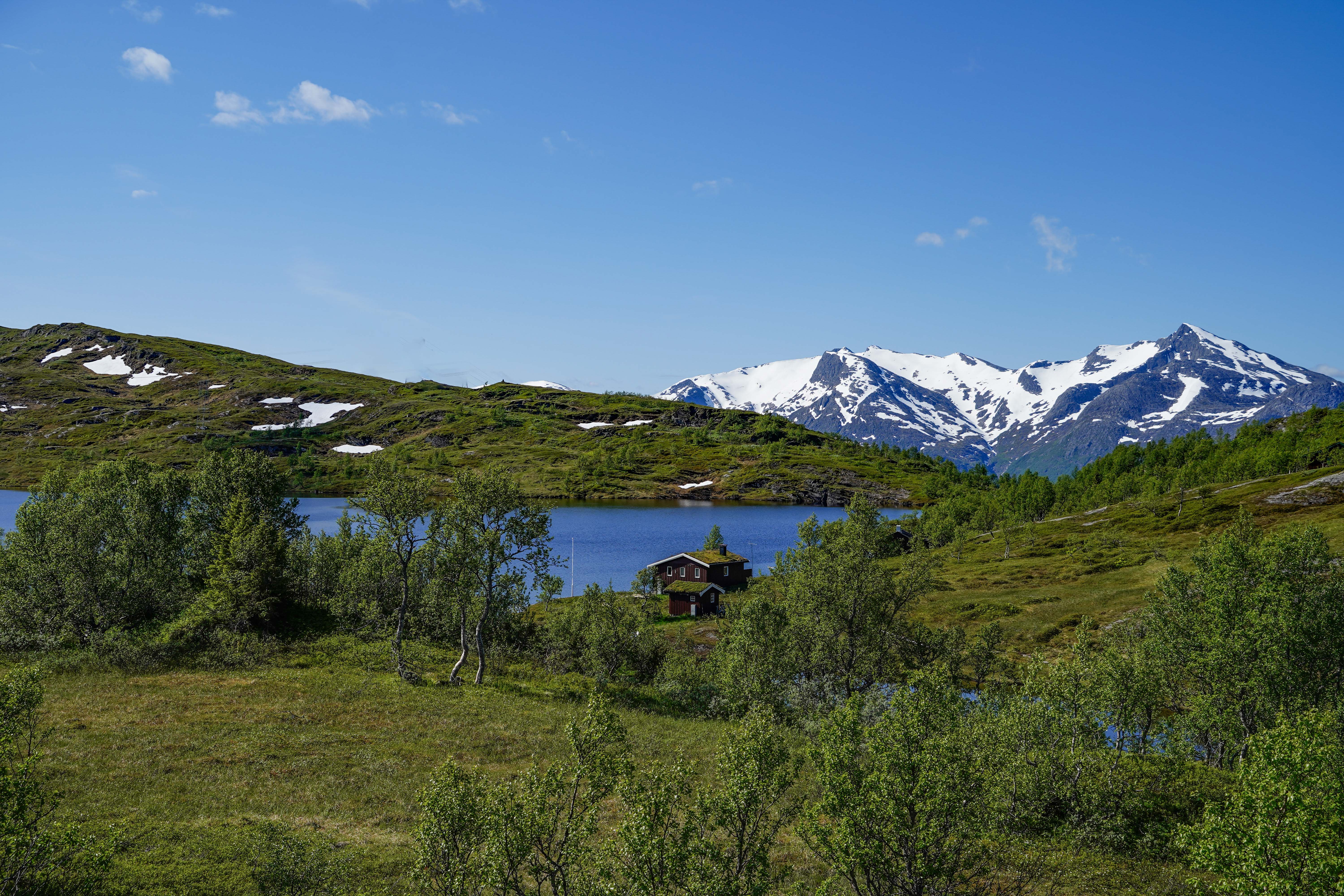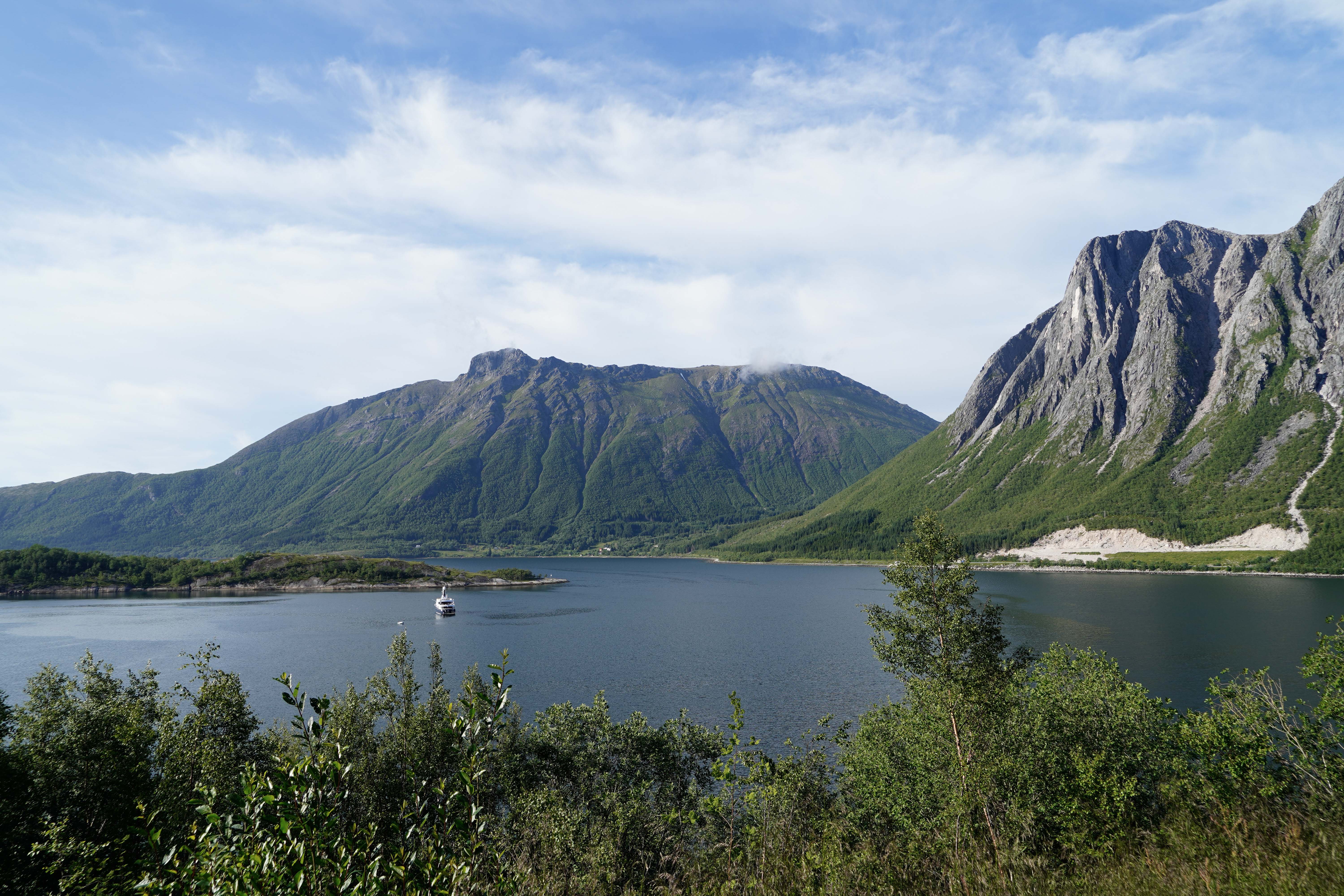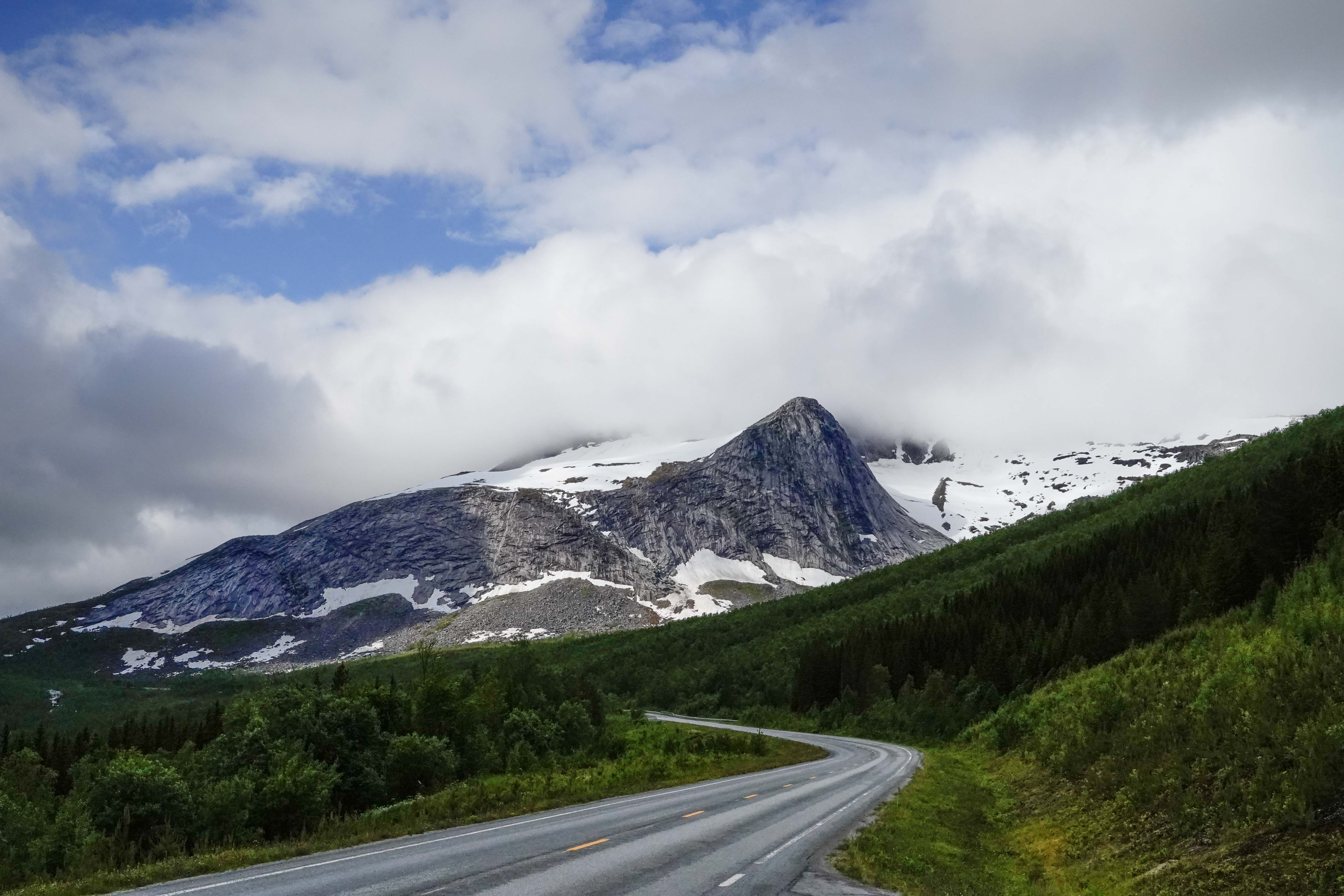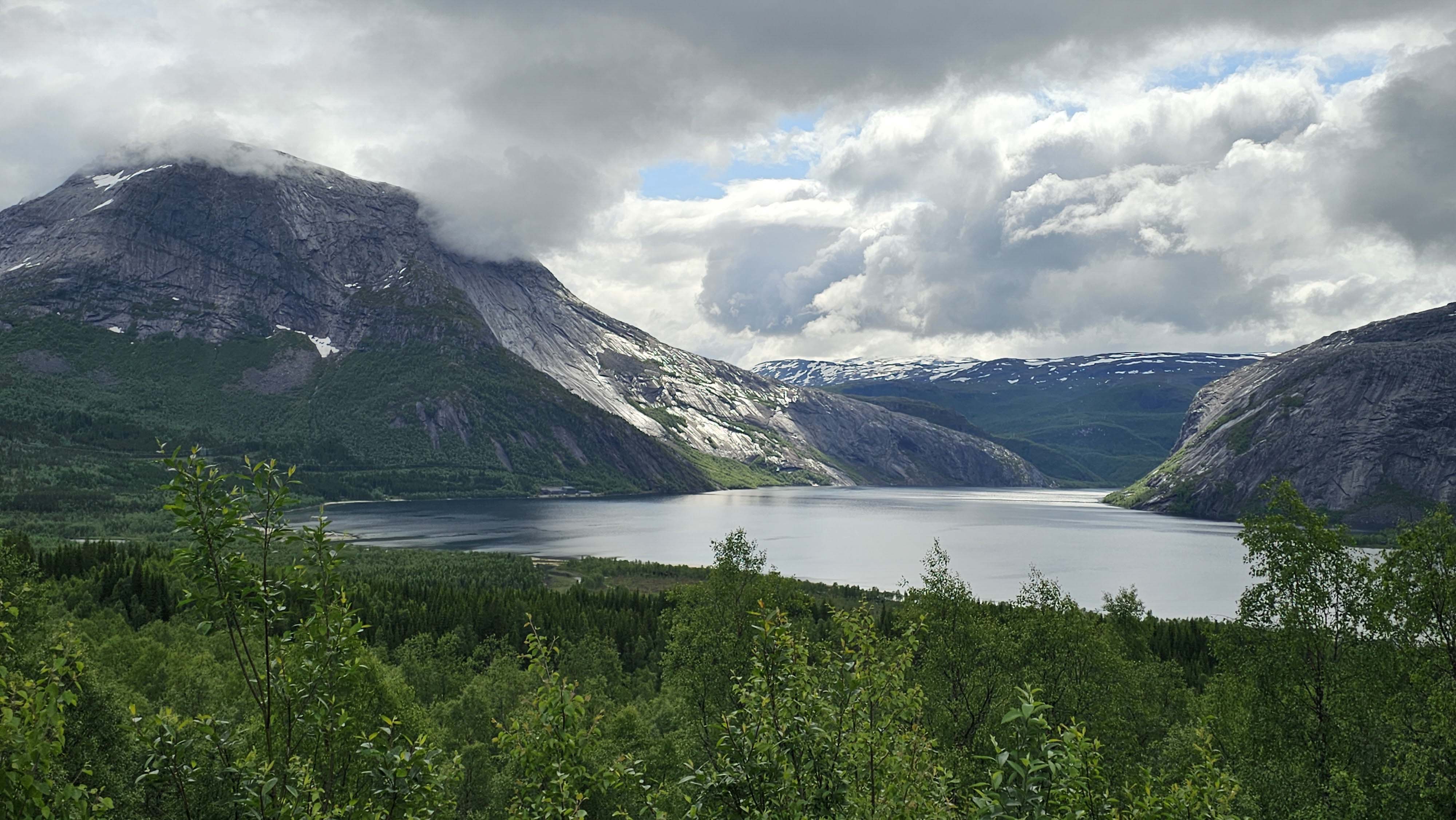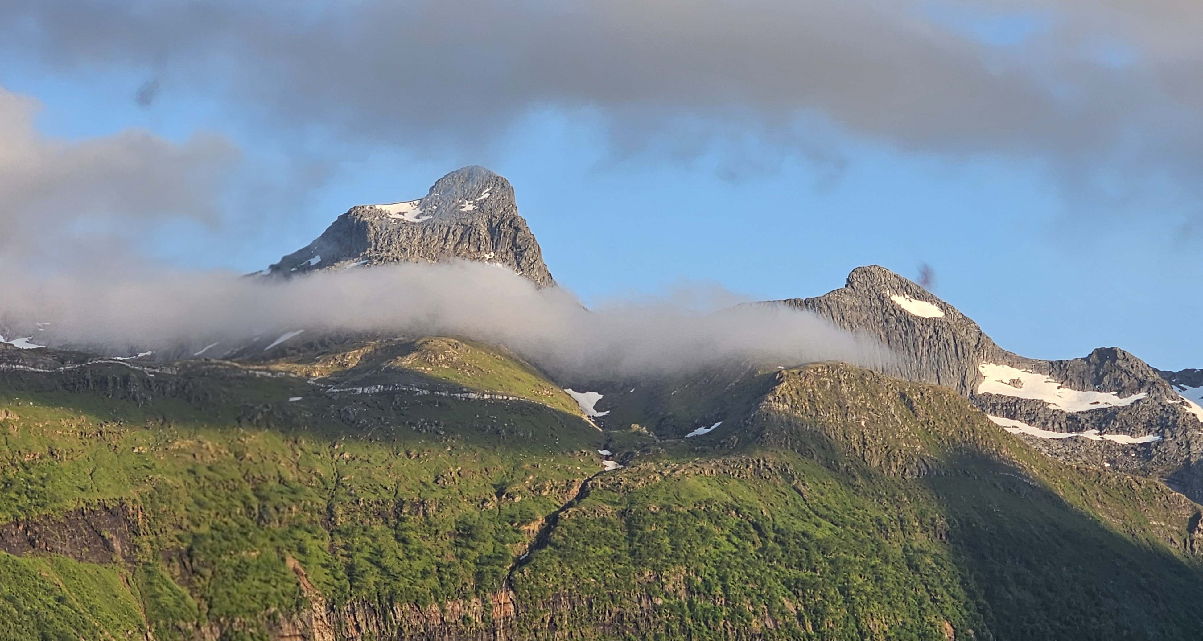 La ruta hasta donde estamos ha sido como ya estamos acostumbrados, fiordo tras fiordo, montañas con mucha nieve y mar, en algunos sitios el verde se mete en el agua y el paisaje es una maravilla. Algún rinconcito de playa a 16 grados que los lugareños aprovechan.