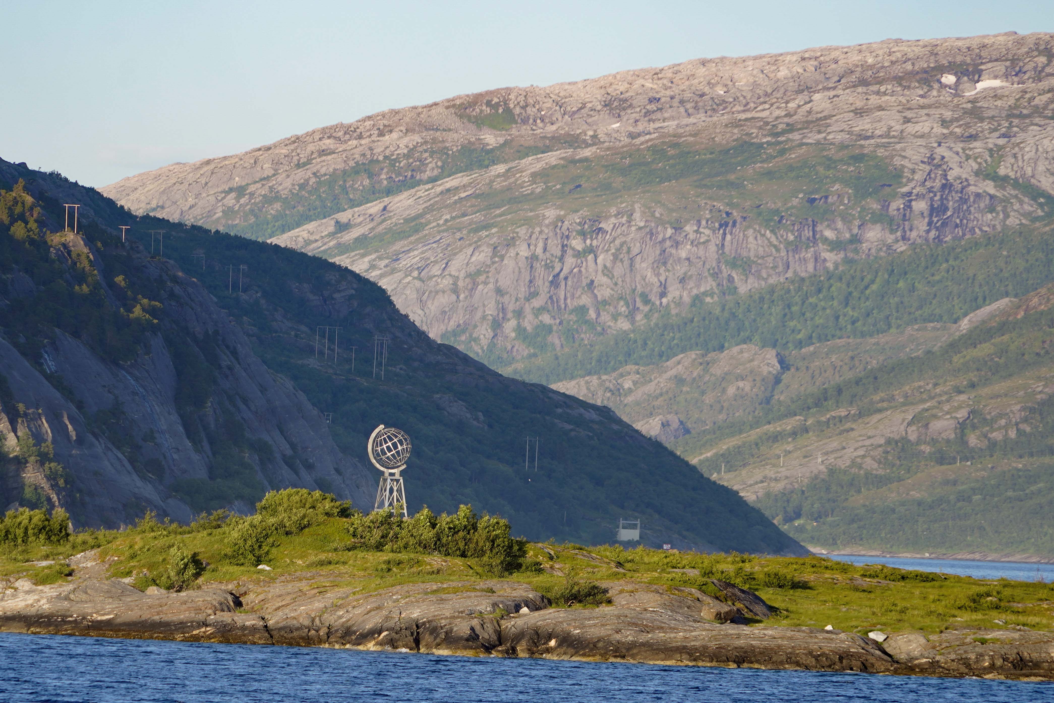 Después hemos recorrido mucha distancia bordeando el Holandfjord, un fiordo rodeado de montañas nevadas al que caen varios glaciares, finalmente, en el segundo ferry hemos pasado hacia el sur el monumento (similar al de Nordkapp) que señala el Círculo Polar.