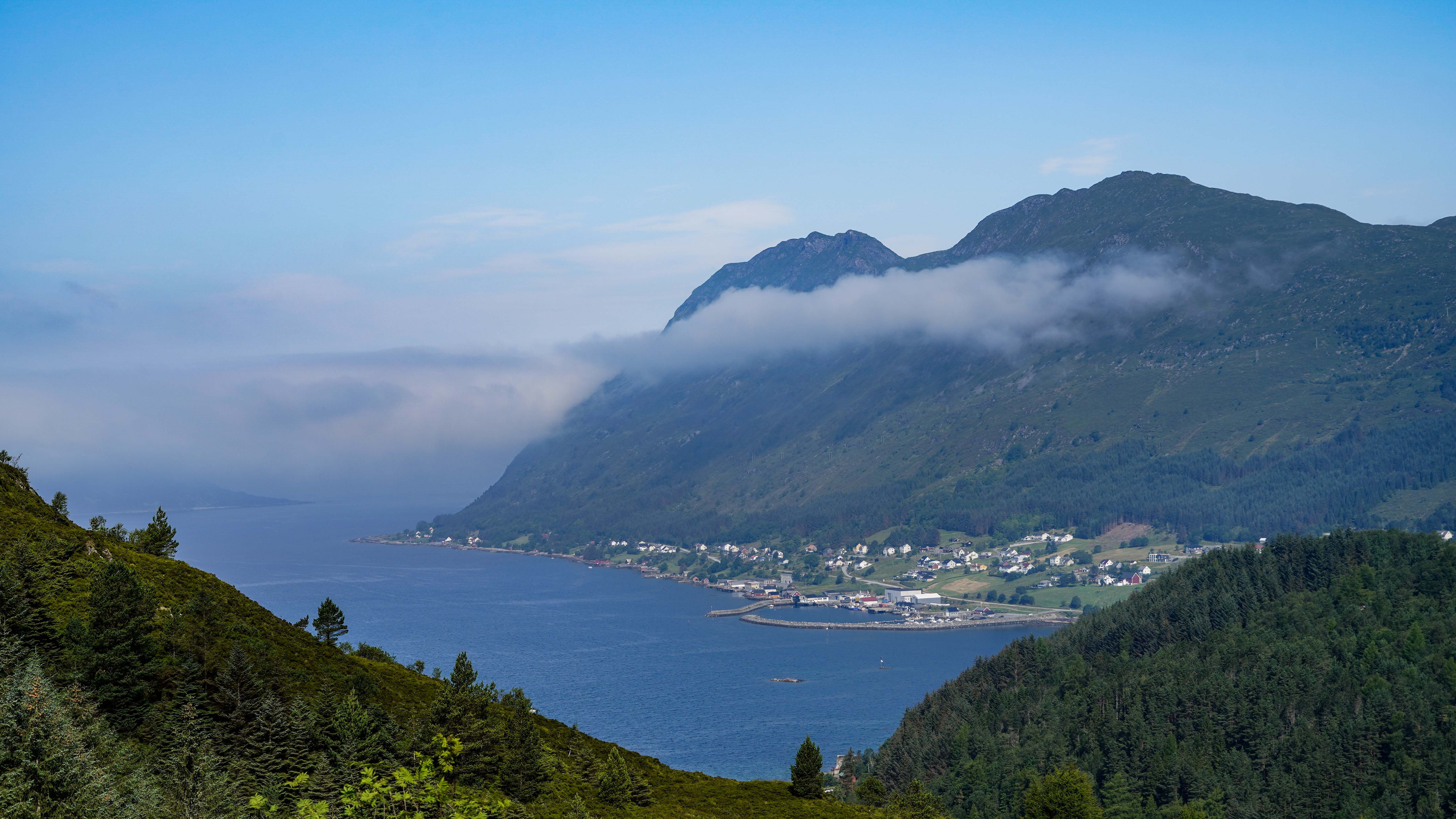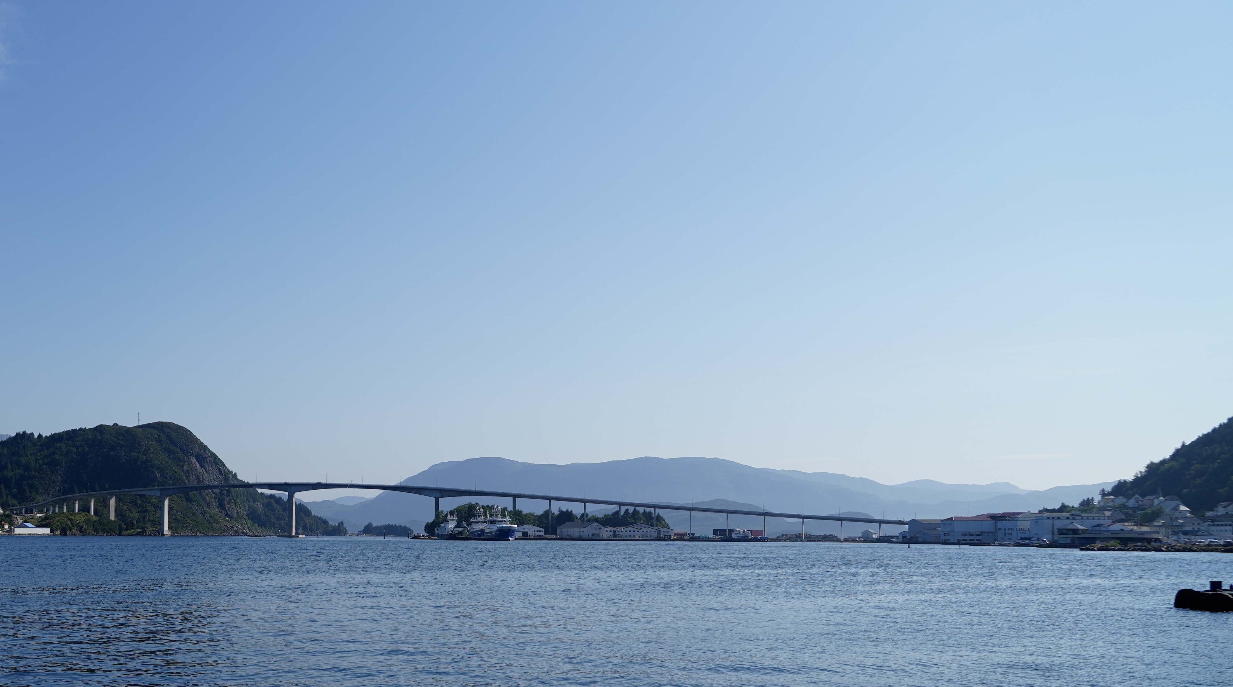 Nos ha amanecido muy neblinoso el día pero, a medida que avanzaba la mañana se ha aclarado. Nosotros hemos ido haciendo camino hasta Måløy. A la ciudad se accede por un puente de 1,2 kilometros, curvado y muy bonito.