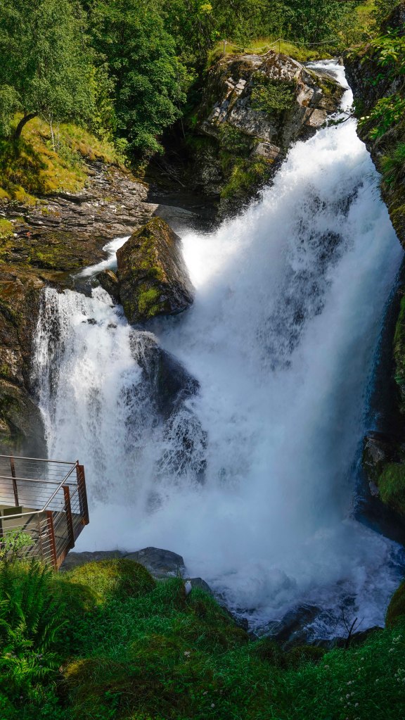 Siguiendo nuestra ruta (hoy ha sido larga) hemos pasado por varias cascadas impresionantes, Tvindefossen, Skjervsfossen, entre otras. Para acabar el día un túnel/puente/túnel extraordinario.