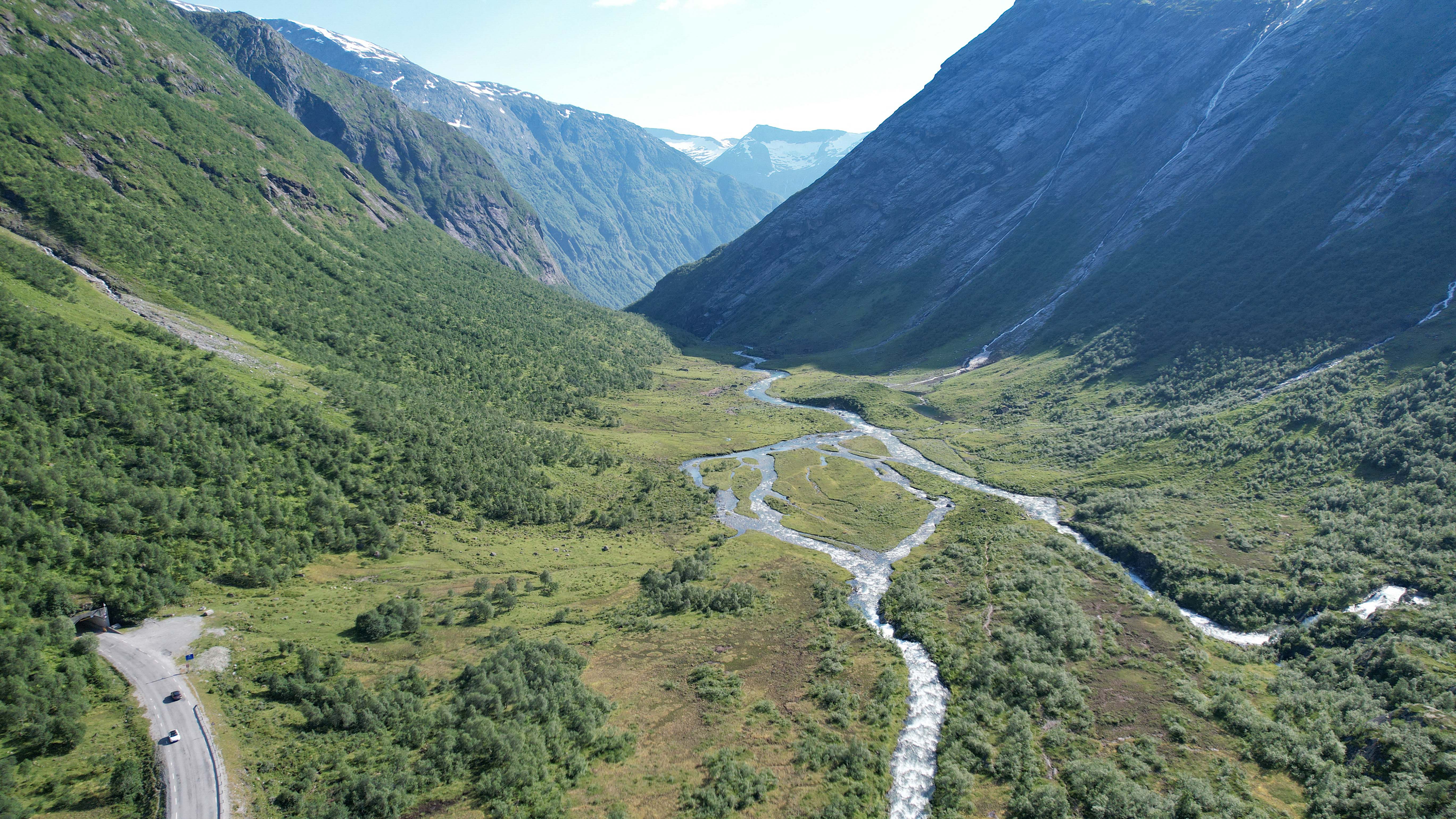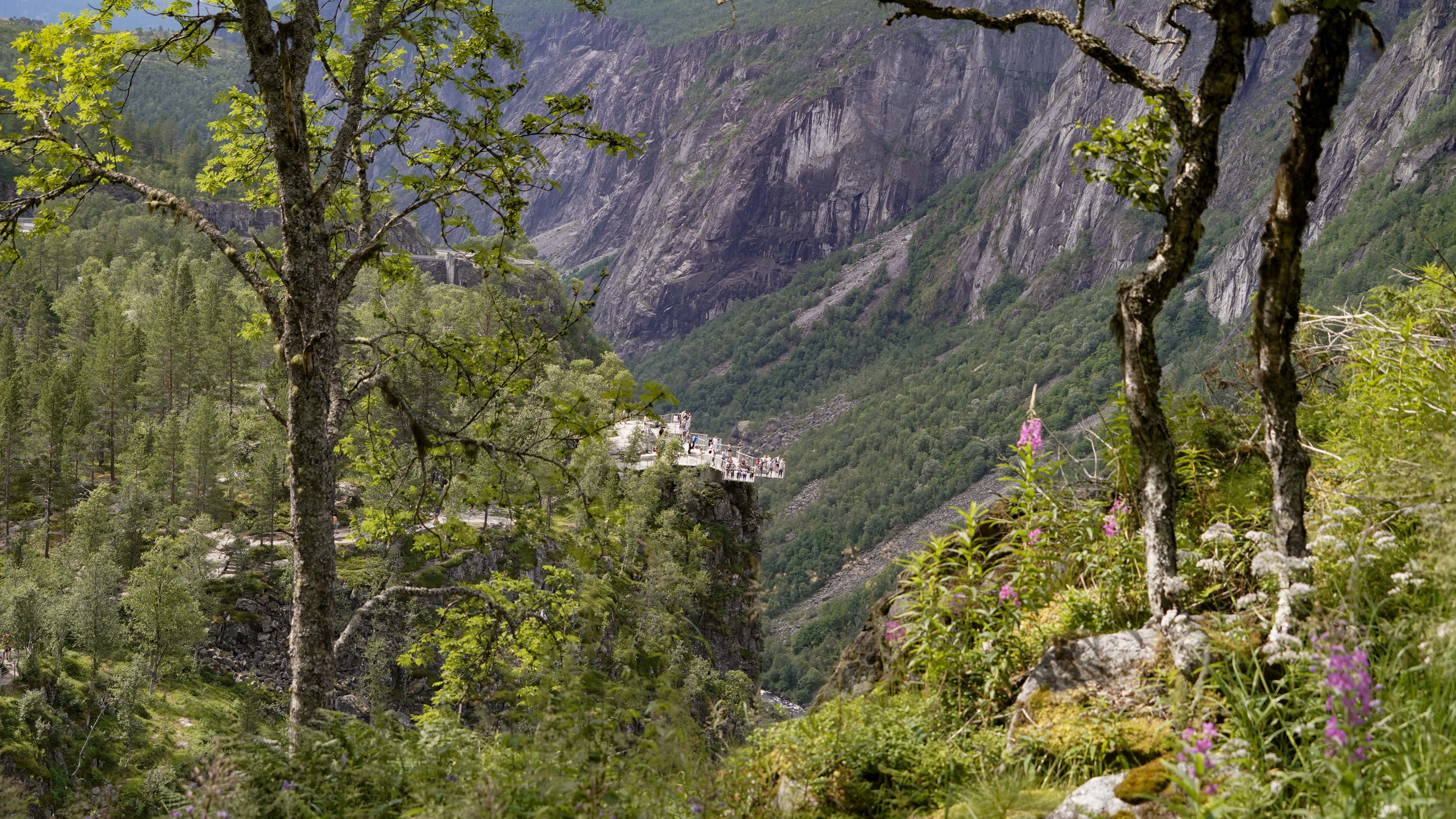 Luego hemos seguido la carretera y enseguida nos hemos encontrado con un tramo de la Kongevegen Om Stalheim, carretera real de Oslo a Bergen que afortunadamente ya no está practicable, tiene entre otras características desniveles del 20% y en su inicio, tras una pequeña ruta se puede ver la Stalheimsfossen.