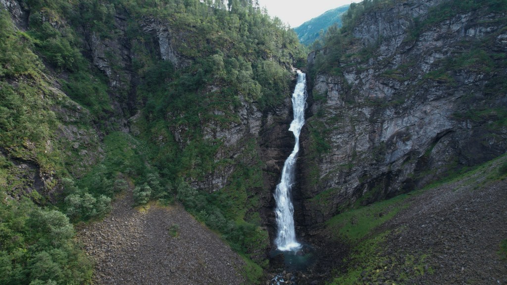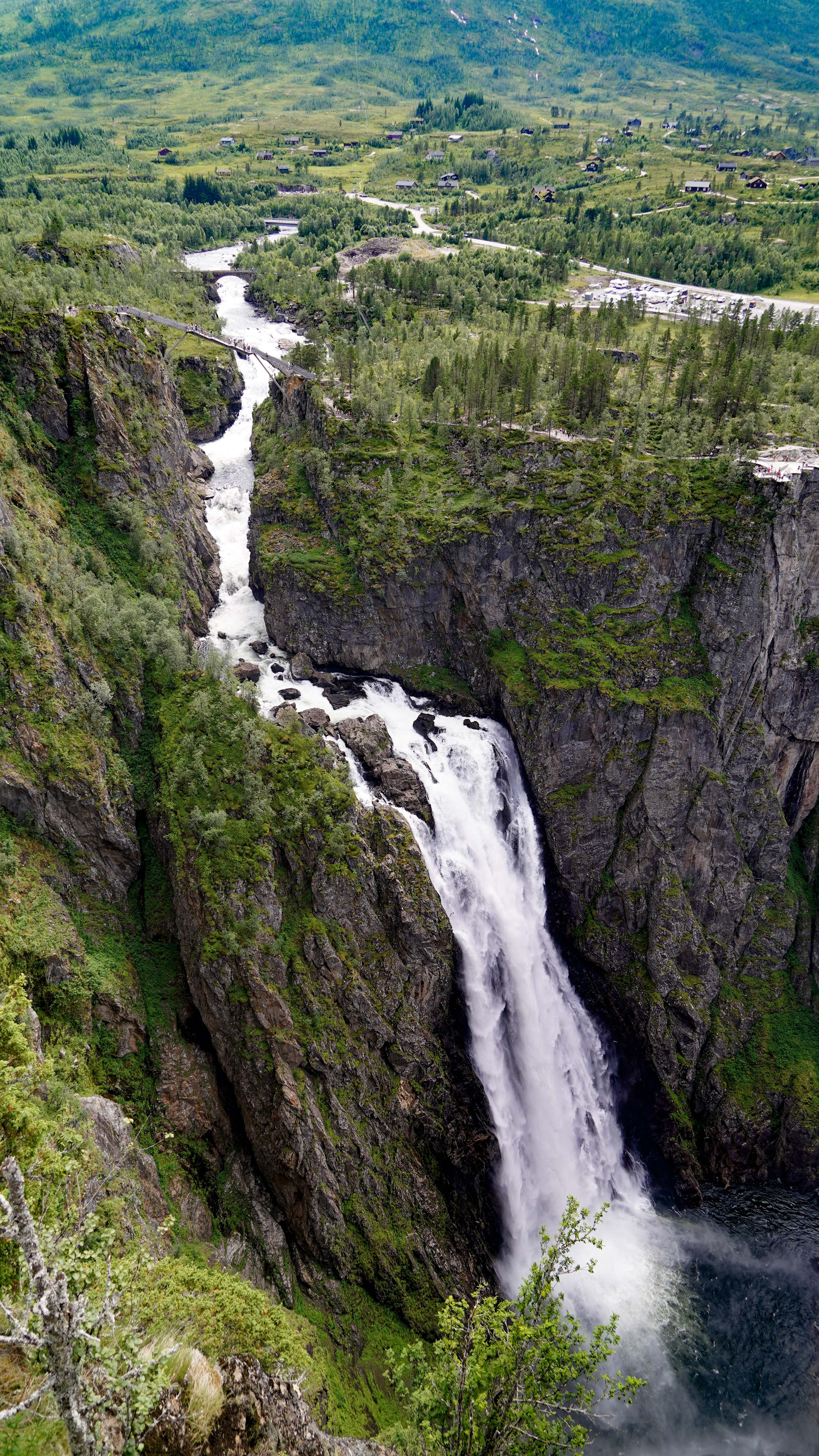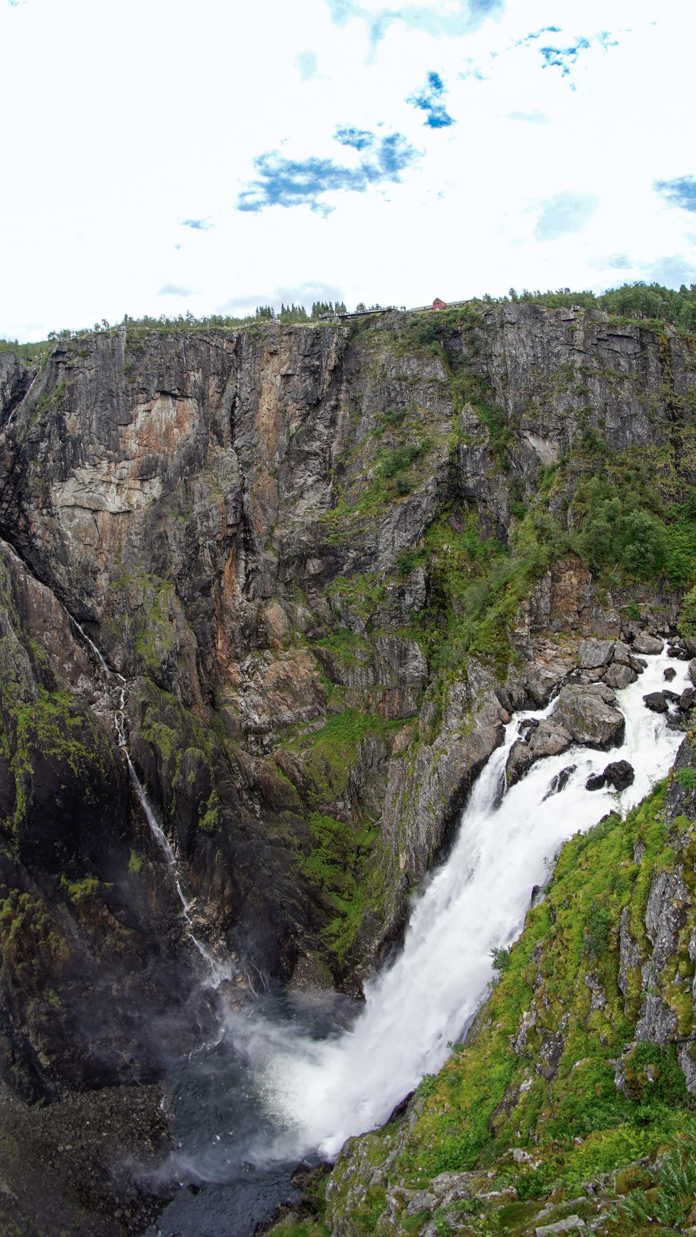 Luego nos hemos dirigido a nuestro objetivo de hoy, a Vøringsfossen. Unas cascadas que convergen en el mismo punto con una altura de 182 metros y una caida libre de 145 metros.