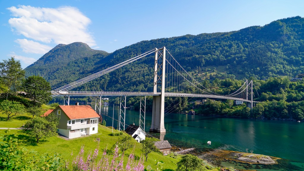Hoy nos hemos despertado con la vista en el puente colgante más largo de Noruega, el Hardangerbrua. Puente de 1.380 metros de longitud con un vano de 1.310 metros. Este puente lo cruzamos ayer, el acceso al mismo es por las dos partes a través de túnel.